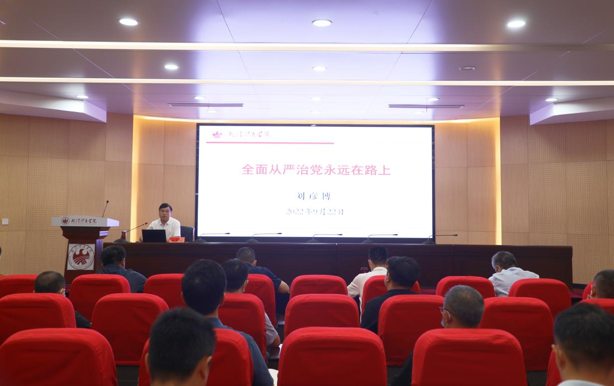 为贯彻落实全面从严治党要求,纵深推进“清廉武体”建设,9月22日上午,党委常委、副校长刘彦博以“全面从严治党永远在路上”为主题讲授廉政教育专题党课。党政办公室、人事处、总务总支(总务处、后勤集团、银湖公司)、新闻传播学院、体育工程与信息技术学院班子成员、党员干部、教师和辅导员参加学习。