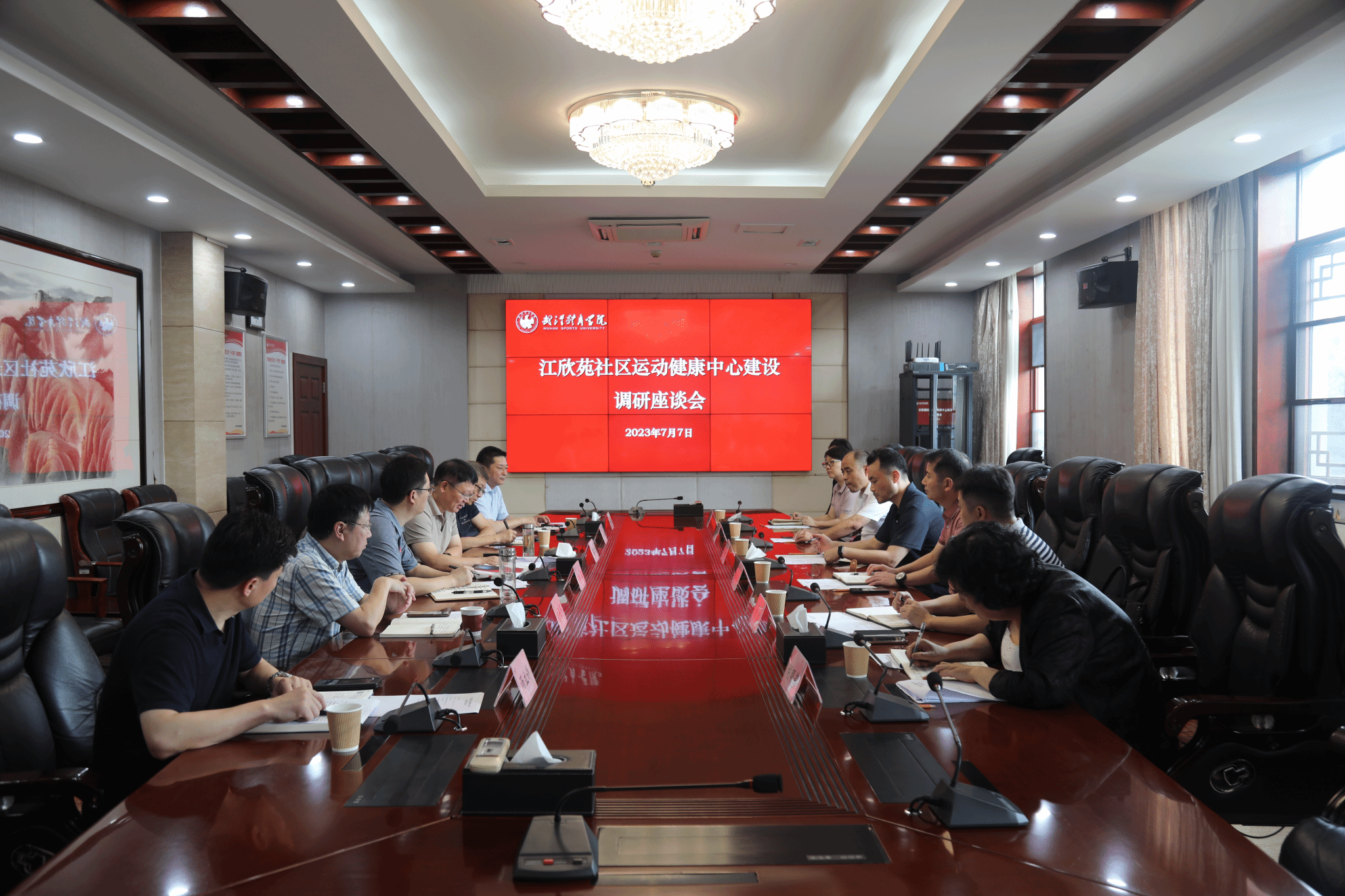 7月7日,省体育局群体处四级调研员刘凯、汉阳区文化和旅游局副局长王传江、江堤街道党工委书记王华勇、江欣苑社区党委书记、居委会主任胡明荣一行来我校,就打造江欣苑社区运动健康中心进行调研交流,党委副书记、院长吕万刚热情接待。